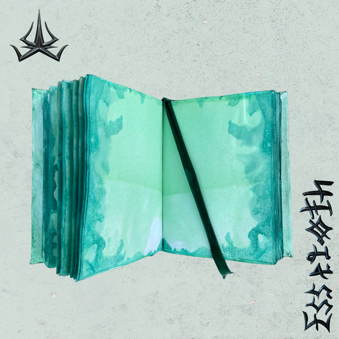 Inside: soft seafoam pages, bled at the edges with deep green staining.