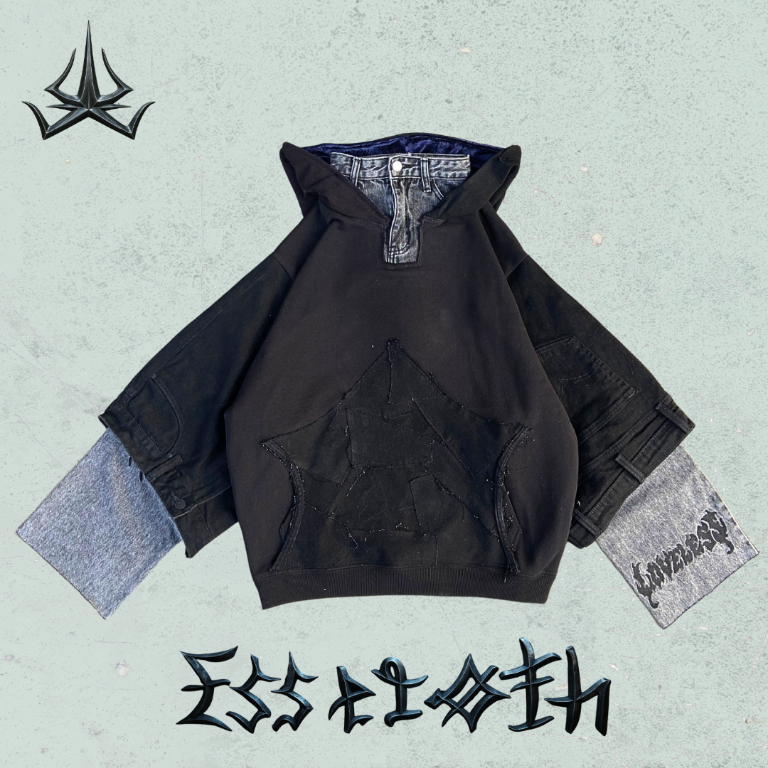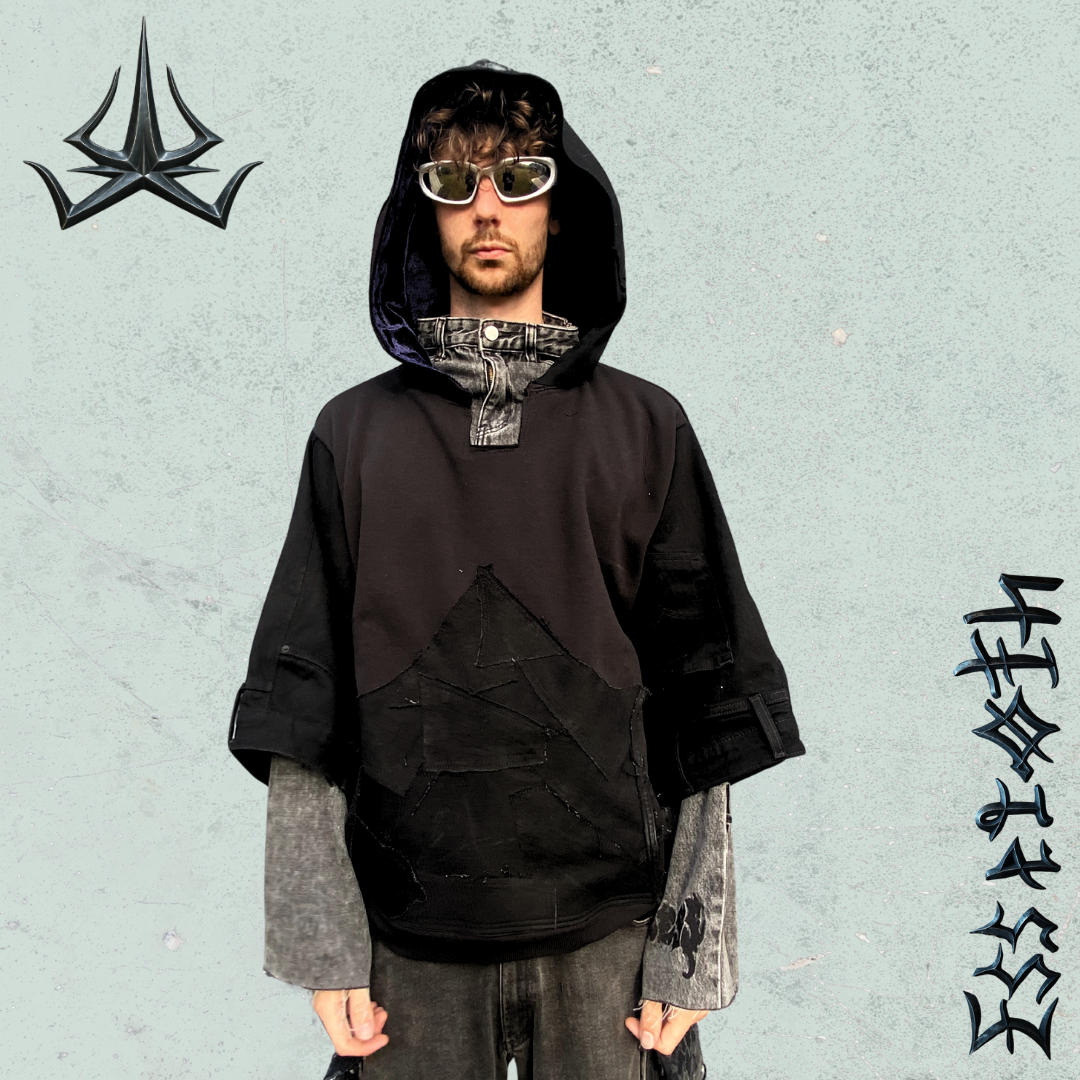 This is the classic ESSERØTH hood, cut with a wizard-shaped silhouette — tall, sharp, and forward-drawn. It frames the face like a shroud or a sigil, designed for those who walk outside the frame.